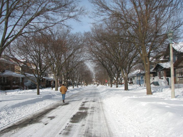 Humphrey House from the street which had been plowed. Notice the massive drift on the roof of the front porch, nearly covering up the bedroom windows.